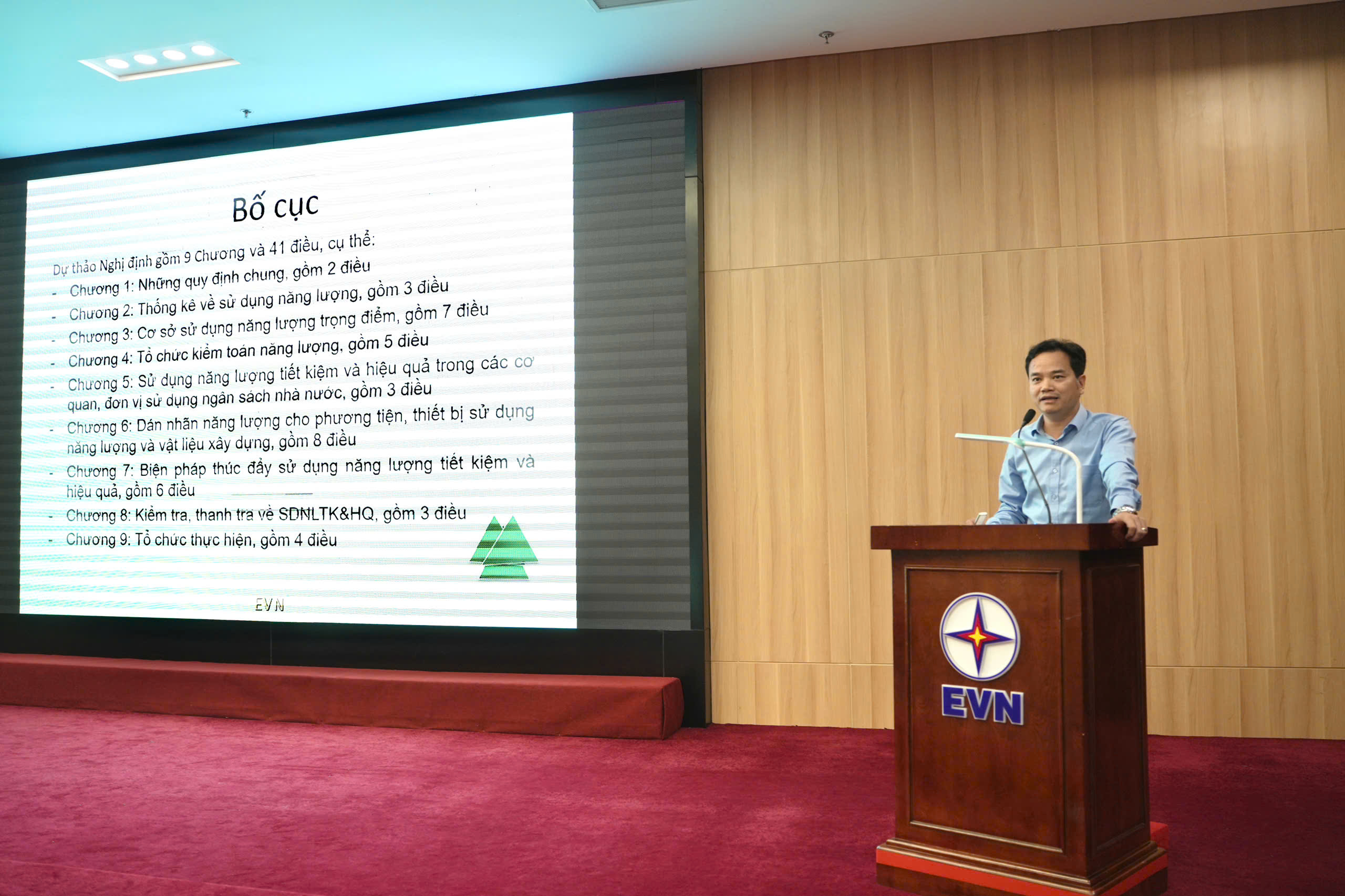 Tại Hội nghị, ông Cù Huy Quang - Trưởng Phòng Hiệu quả năng lượng và Chuyển đổi xanh (Cục Đổi mới sáng tạo, Chuyển đổi xanh và Khuyến công) đã chia sẻ chi tiết dự thảo Nghị định của Chính phủ quy định chi tiết và hướng dẫn thi hành Luật Sử dụng năng lượng tiết kiệm và hiệu quả.