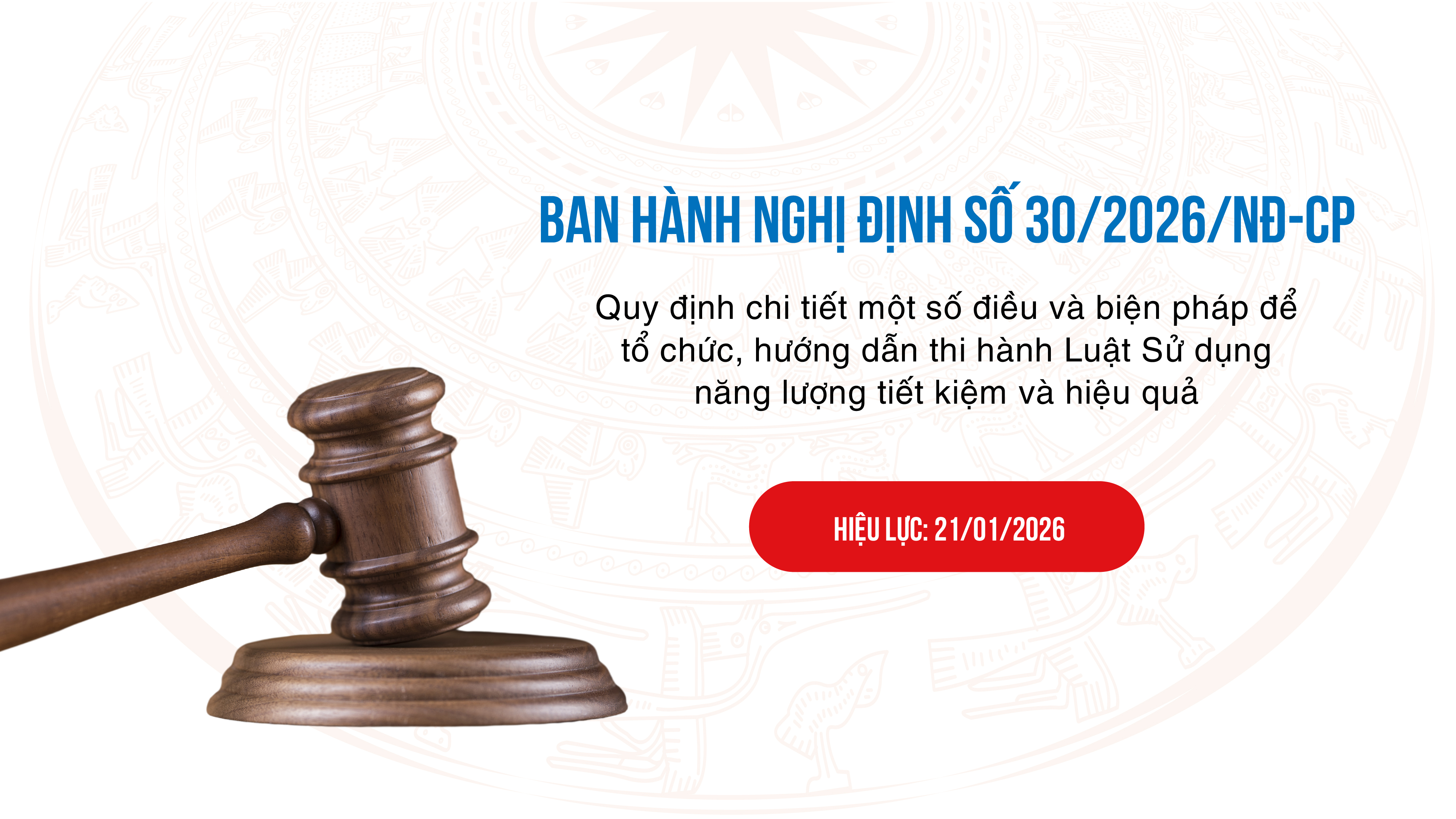 Ngày 21 tháng 01 năm 2026, Chính phủ ban hành Nghị định số 30/2026/NĐ-CP quy định chi tiết một số điều và biện pháp để tổ chức, hướng dẫn thi hành Luật Sử dụng năng lượng tiết kiệm và hiệu quả.