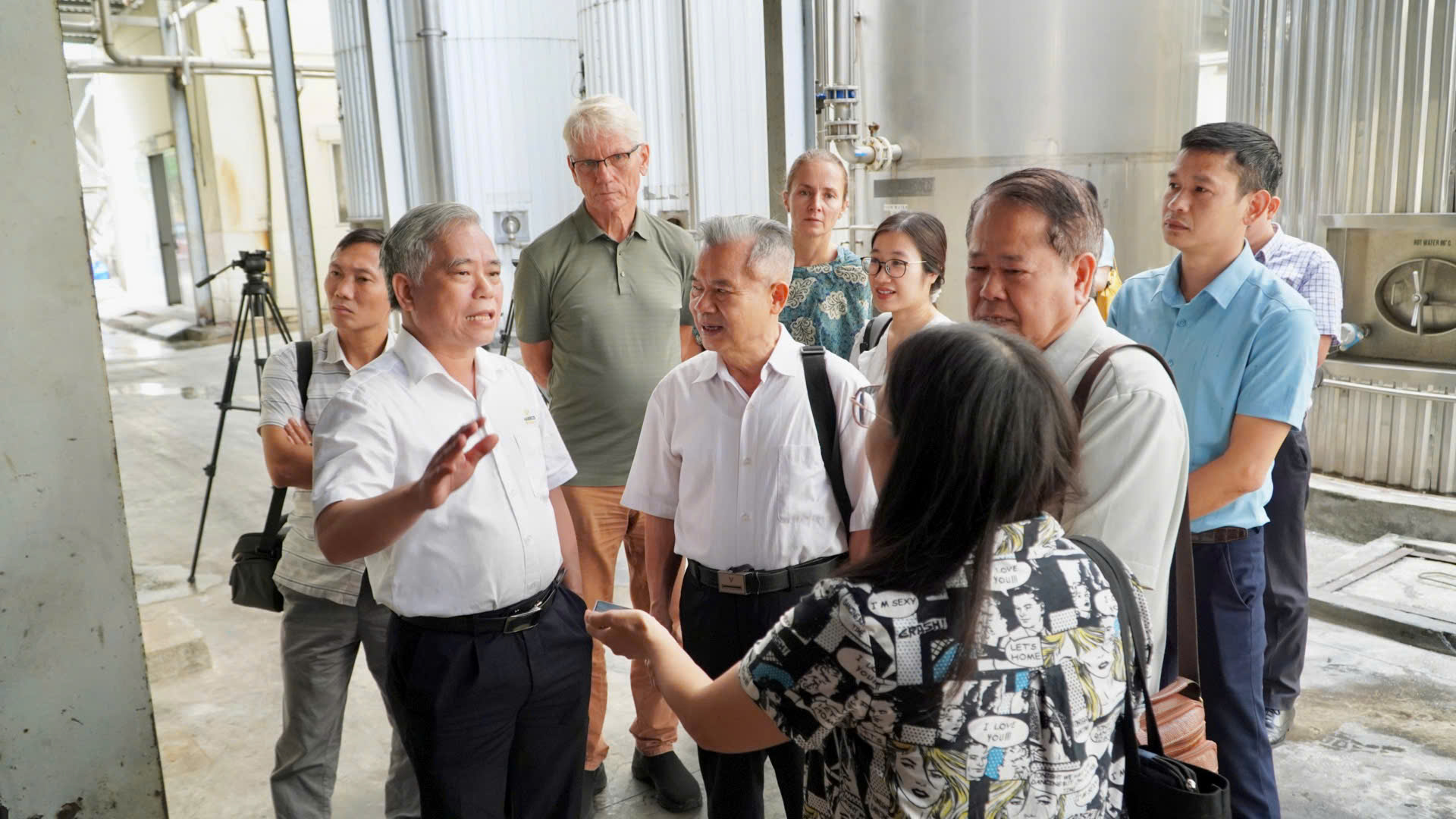 Ông Trần Đăng Tuấn – Phó Giám đốc HABECO-ID (áo trắng, bên trái) giới thiệu về giải pháp tiết kiệm năng lượng tại nhà máy.