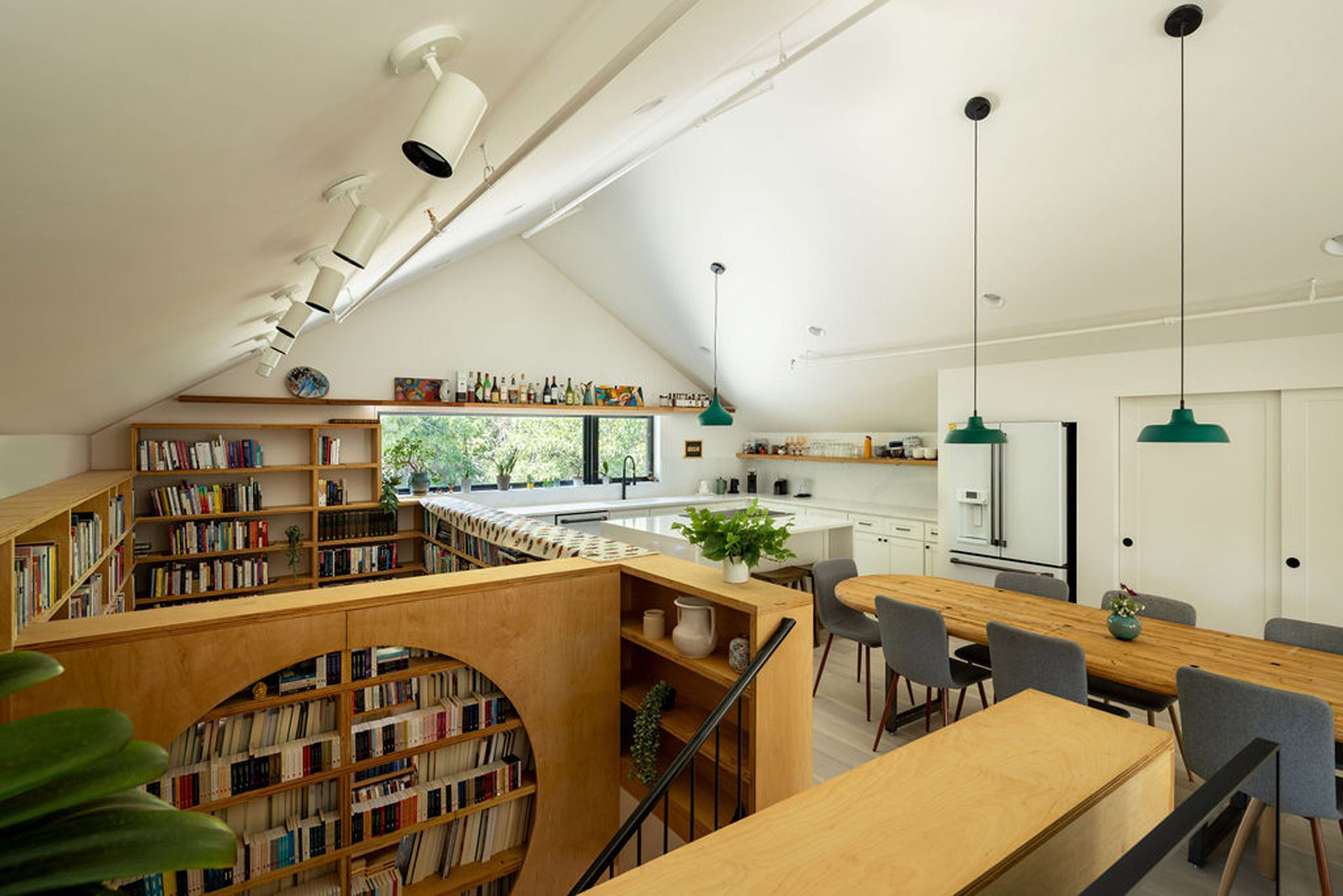 Bên trong, các vật liệu tái chế được biến hóa khéo léo để phân chia các khu vực chức năng. Ở tầng dưới, lối đi từ ga-ra dẫn vào thư viện và phòng ngủ cho khách, sau đó thông tới phòng ngủ chính ở phía Đông ngôi nhà. Điểm nhấn kết nối giữa các tầng là thư viện thông tầng với cầu thang làm từ gỗ thông đường. Lên đến tầng trên, phần sàn gỗ từ một tiệm bowling cũ đã được cải tạo thành các hệ kệ sách và kệ bếp nằm gọn dưới khung mái đầu hồi.