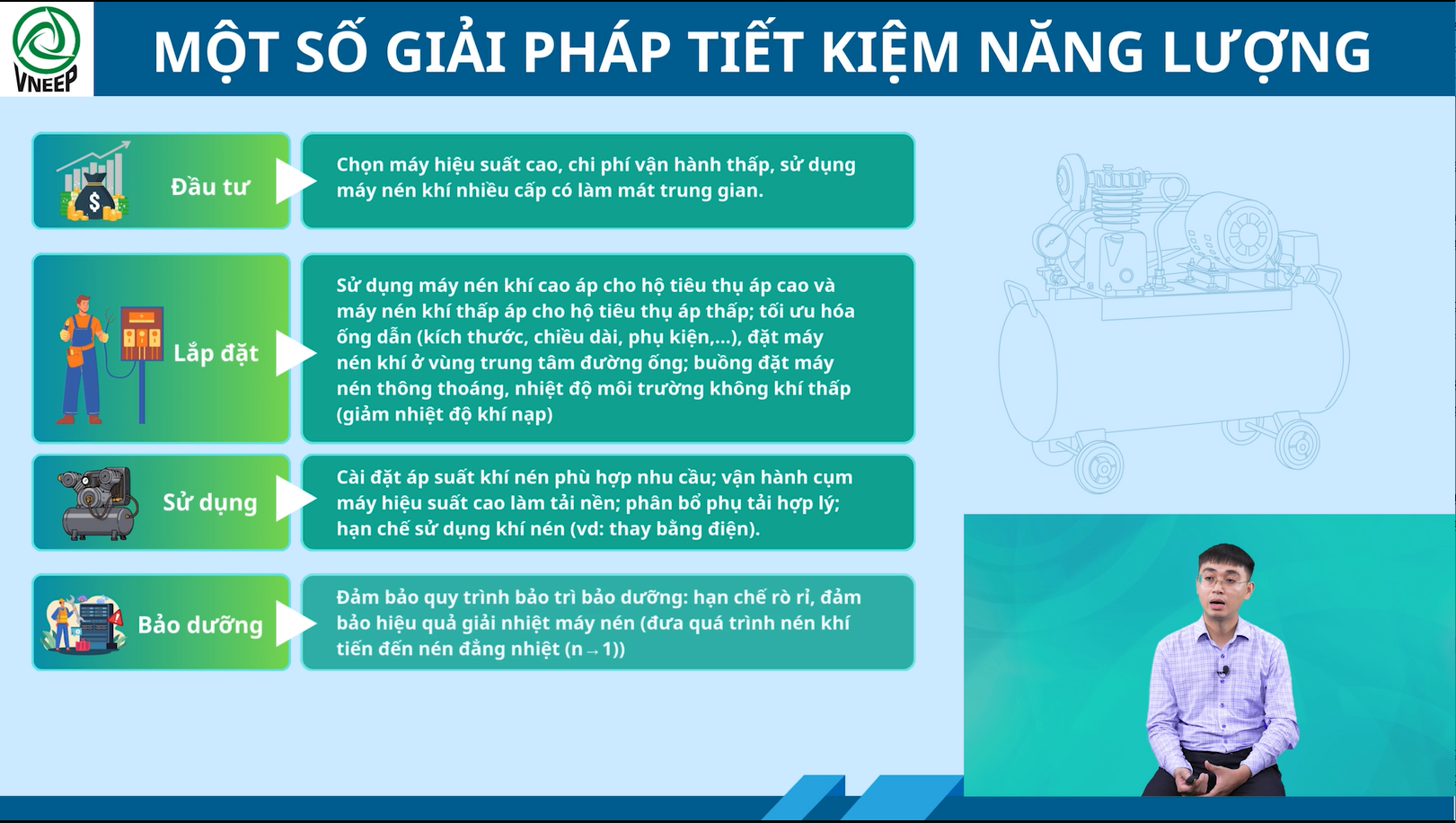 Trong chuỗi 10 bài giảng điện tử được phát triển và đăng tải trên nền tảng Cộng đồng Hiệu quả năng lượng Việt Nam, chuyên đề “Sử dụng năng lượng tiết kiệm và hiệu quả trong hệ thống khí nén” tập trung vào hệ thống khí nén – một hệ thống tiêu thụ nhiều điện năng trong sản xuất công nghiệp. Chuyên đề do giảng viên Nguyễn Trọng Hậu – Trưởng phòng Tư vấn giải pháp, Công ty Cổ phần Giải pháp Công nghệ Việt Nam chia sẻ. Với nhiều năm kinh nghiệm trong tư vấn và triển khai các giải pháp kỹ thuật cho hệ thống khí nén tại doanh nghiệp, giảng viên mang đến cách tiếp cận bài bản, gắn với thực tiễn vận hành và mục tiêu giảm chi phí năng lượng.