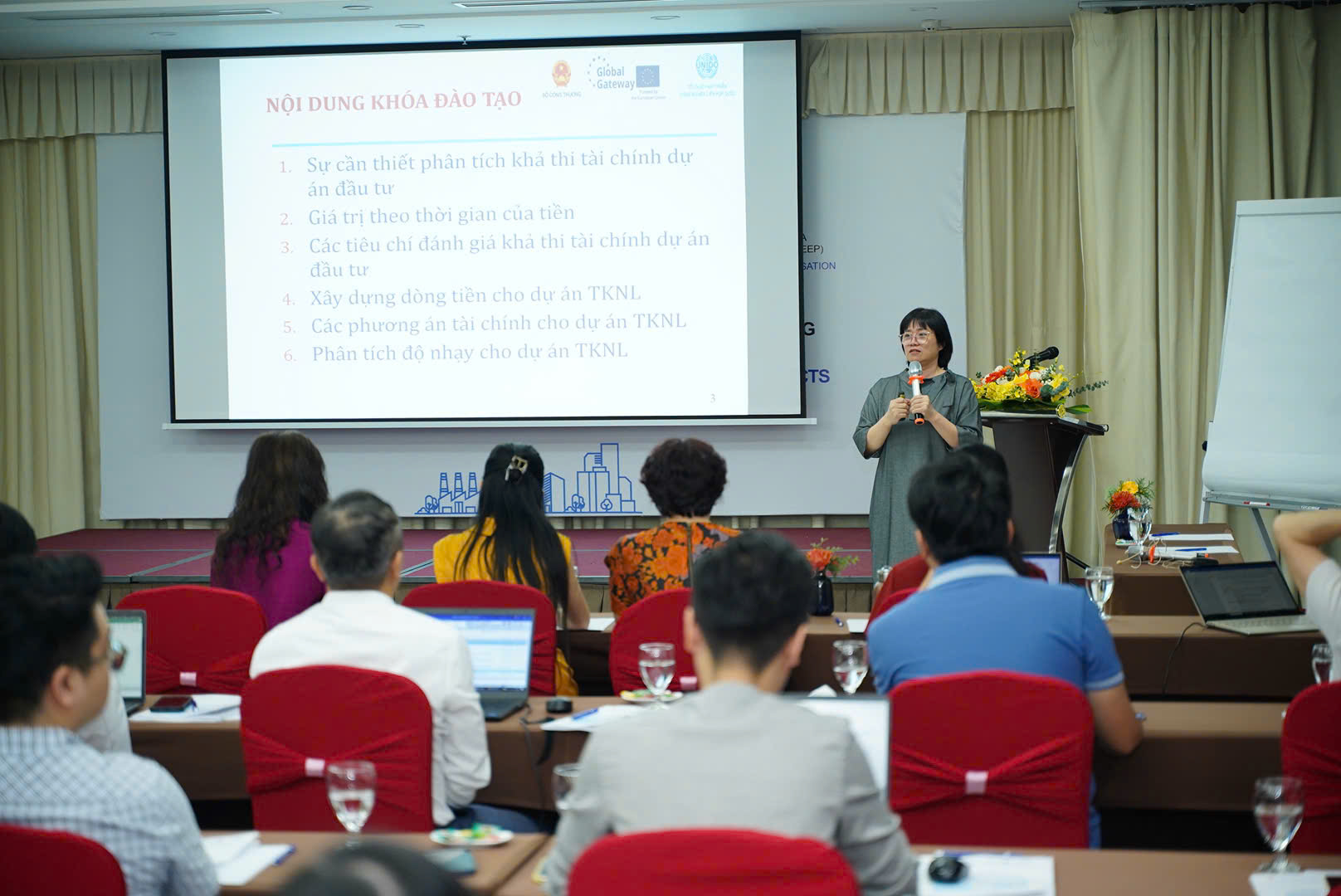 Phát biểu khai mạc tại sự kiện, bà Nguyễn Thị Lâm Giang, Cục trưởng Cục Đổi mới Sáng tạo, Chuyển đổi xanh và Khuyến công - Bộ Công Thương đánh giá cao lợi ích cốt lõi của khóa học "Phân tích tài chính dự án đầu tư tiết kiệm năng lượng" đối với nền kinh tế- xã hội- môi trường Việt Nam. Đối với doanh nghiệp công nghiệp sản xuất, đó là hiệu quả tài chính và tối ưu hóa dòng tiền vận hành, là khả năng cạnh tranh và quản trị hiện đại; Đối với hệ sinh thái vốn xanh và tài trợ bền vững, là việc mở rộng cơ hội tiếp cận vốn xanh và các nguồn tài trợ bằng cách chứng minh tính khả thi tài chính và rủi ro được kiểm soát; Về đổi mới sáng tạo và phát triển bền vững, đó là khuyến khích doanh nghiệp đầu tư vào công nghệ tiết kiệm năng lượng và các giải pháp quản lý hiệu quả; Về lợi ích xã hội và môi trường cho Việt Nam, là giảm phát thải, an ninh năng lượng và đóng góp vào mục tiêu phát triển bền vững quốc gia.