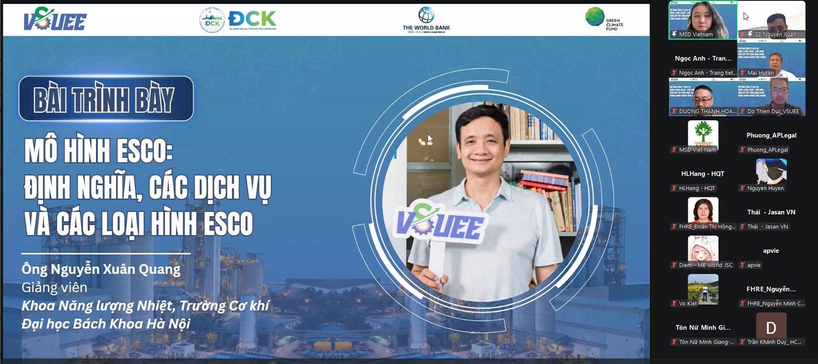 Mở đầu buổi hội thảo, ông Nguyễn Xuân Quang - Giảng viên Khoa Năng lượng Nhiệt, Trường Cơ khí, Đại học Bách khoa Hà Nội - giới thiệu tổng quan về mô hình ESCO, nhấn mạnh đây là một mô hình đã hình thành từ những năm 1970 của thế kỷ trước, phát triển mạnh tại châu Âu và Bắc Mỹ, và đã chứng minh được vai trò quan trọng trong việc thúc đẩy các dự án tiết kiệm năng lượng, đặc biệt trong lĩnh vực công nghiệp và tòa nhà.