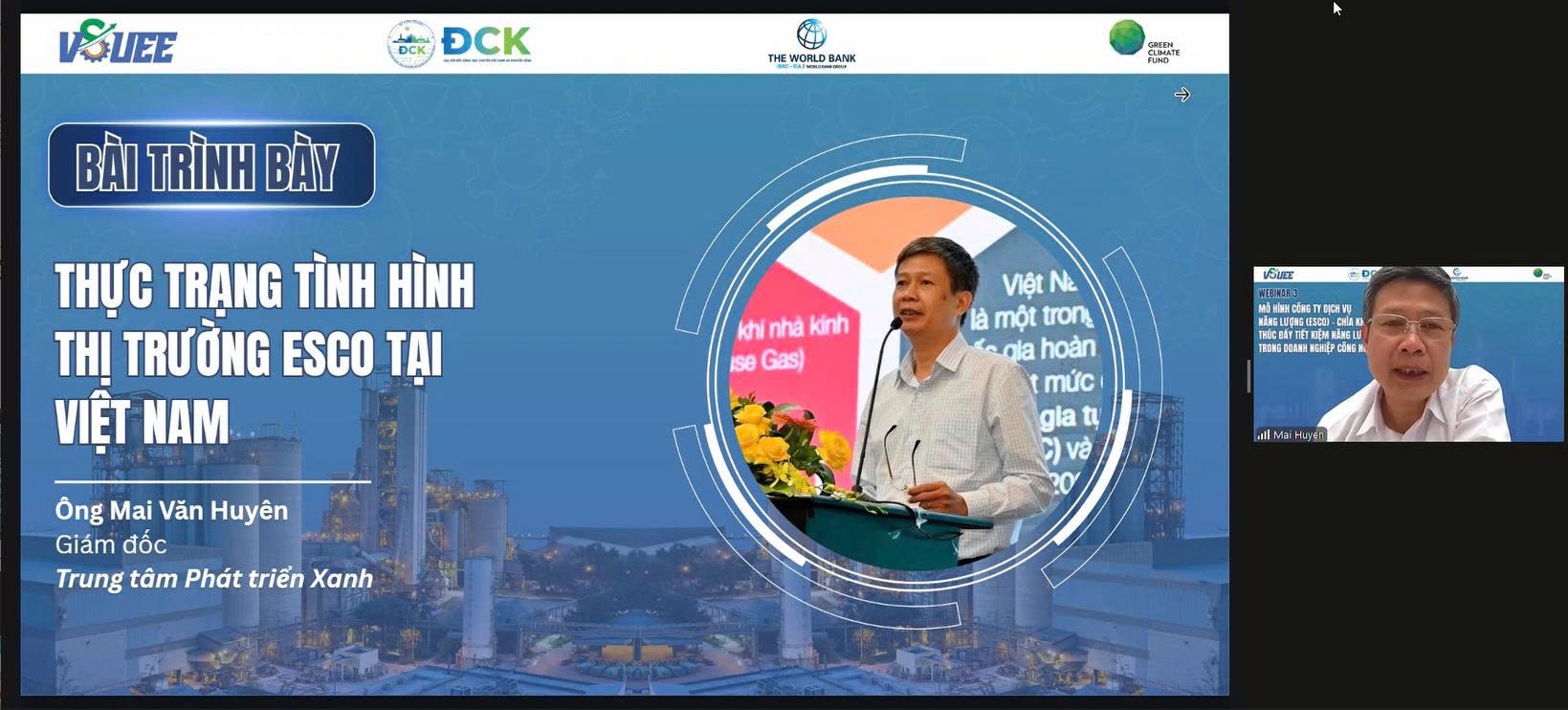 Tại hội thảo, các đại biểu đã được lắng nghe ông Mai Văn Huyên - Giám đốc Trung tâm Phát triển Xanh trình bày về thực trạng và tiềm năng phát triển mô hình ESCO tại Việt Nam. Theo ông Huyên, hiện nay thị trường Việt Nam có tiềm năng lớn trong lĩnh vực dịch vụ năng lượng, song còn thiếu các yếu tố nền tảng để phát triển mạnh mẽ. Theo kết quả khảo sát, Việt Nam có hơn 100 doanh nghiệp cung cấp dịch vụ liên quan đến tiết kiệm năng lượng, nhưng chỉ một phần nhỏ hoạt động đúng mô hình ESCO, có đủ năng lực tài chính và kỹ thuật để đầu tư trọn gói dự án.