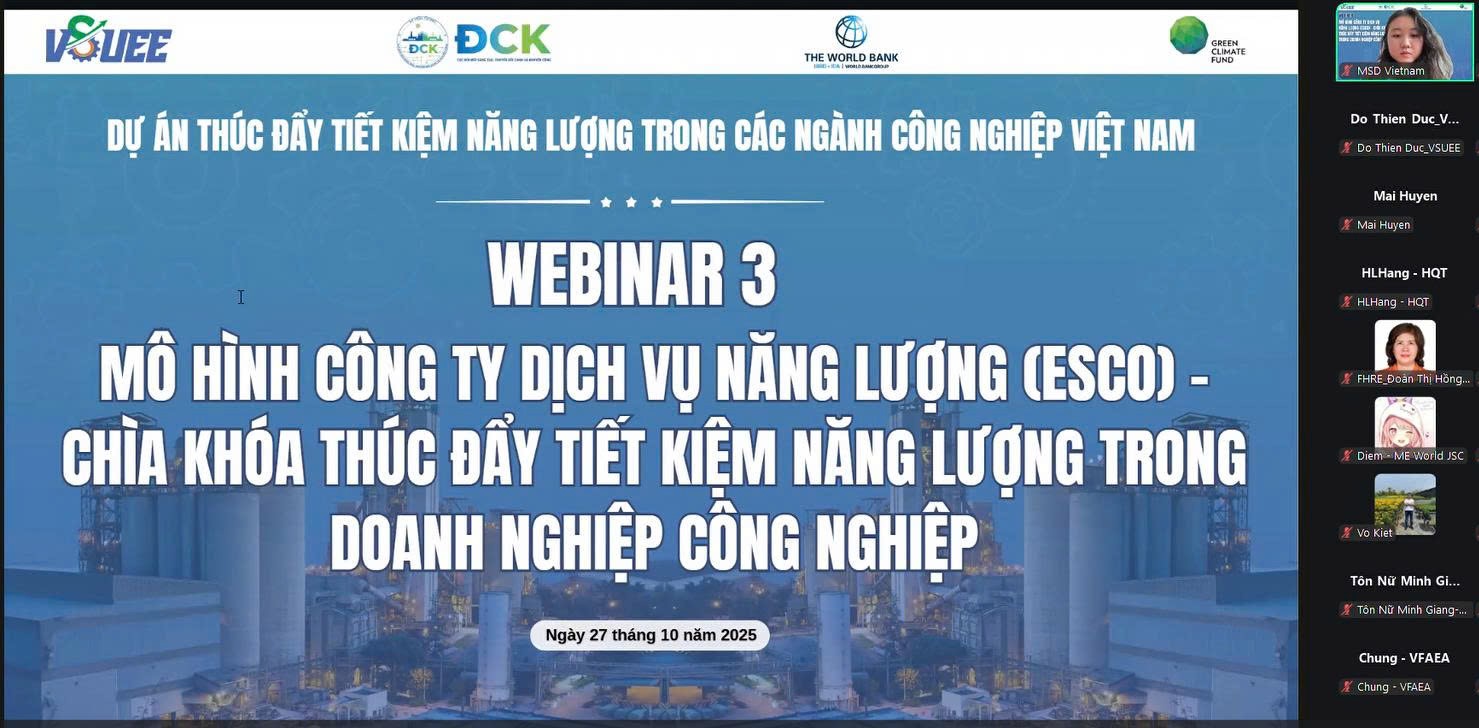 Chiều ngày 27/10/2025, trong khuôn khổ Dự án “Thúc đẩy tiết kiệm năng lượng trong các ngành công nghiệp Việt Nam” (VSUEE), Cục Đổi mới sáng tạo, Chuyển đổi xanh và Khuyến công (Bộ Công Thương) đã tổ chức hội thảo trực tuyến số 3 với chủ đề “Mô hình Công ty Dịch vụ Năng lượng (ESCO): Chìa khóa thúc đẩy tiết kiệm năng lượng trong doanh nghiệp công nghiệp”.