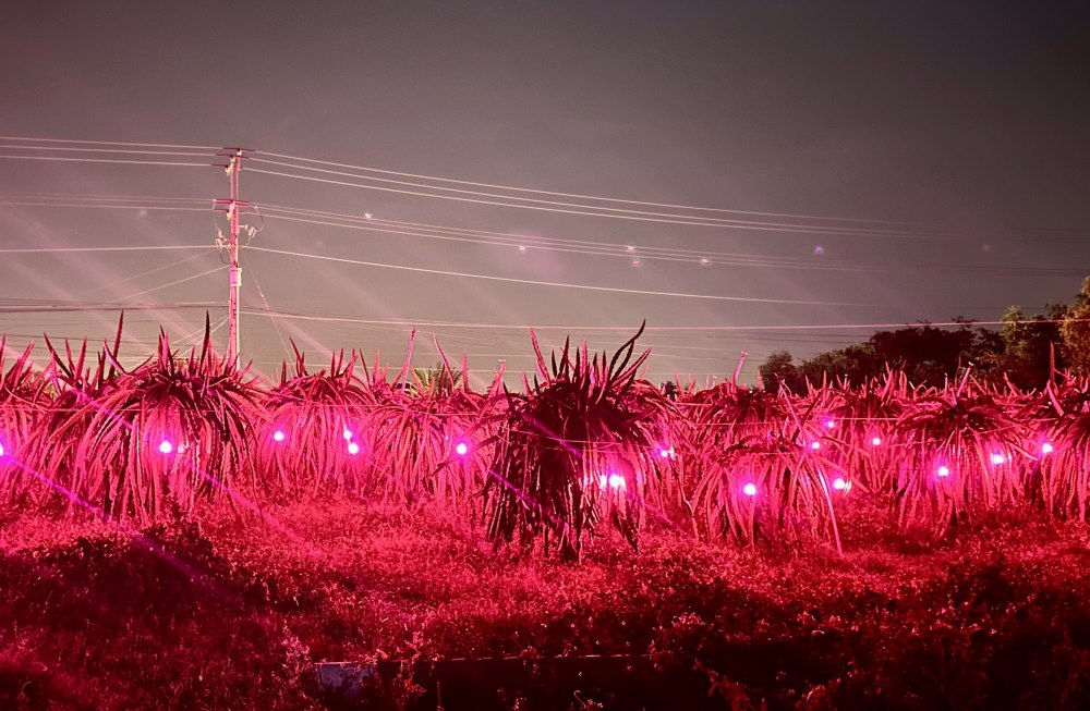 Chong đèn cho thanh long vào ban đêm. Ảnh: Duy Tuấn